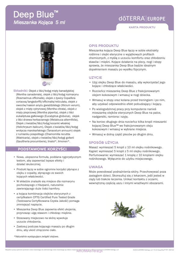 Mieszanka kojąca Deep Blue łączy w sobie ekstrakty roślinne i olejki eteryczne o wyjątkowych profilach chemicznych, z myślą o uczuciu komfortu oraz chłodzeniu stawów i mięśni. Kojące działanie na plecy, nogi i stopy sprawia, że mieszanka Deep Blue będzie idealnym dopełnieniem masażu po wysiłku fizycznym.