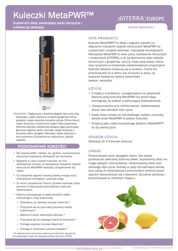 Mieszanka olejków eterycznych MetaPWR została stworzona z myślą o wsparciu stylu życia skupionego na większej witalności, lepszych wyborach żywieniowych oraz zachowaniu dobrego samopoczucia. Mieszanka MetaPWR to owoc pracy naukowców klinicznych i medycznych doTERRA, a do jej stworzenia użyto olejków CPTG™ z grejpfruta, cytryny, mięty pieprzowej, imbiru oraz cynamonu – w idealnie zbalansowanych proporcjach. Połączenie cytrusowych, miętowych i korzennych olejków sprawia, że MetaPWR jest niezwykle intensywnym środkiem aromatyzującym, który pozwoli Ci zaspokoić chęć na coś słodkiego!