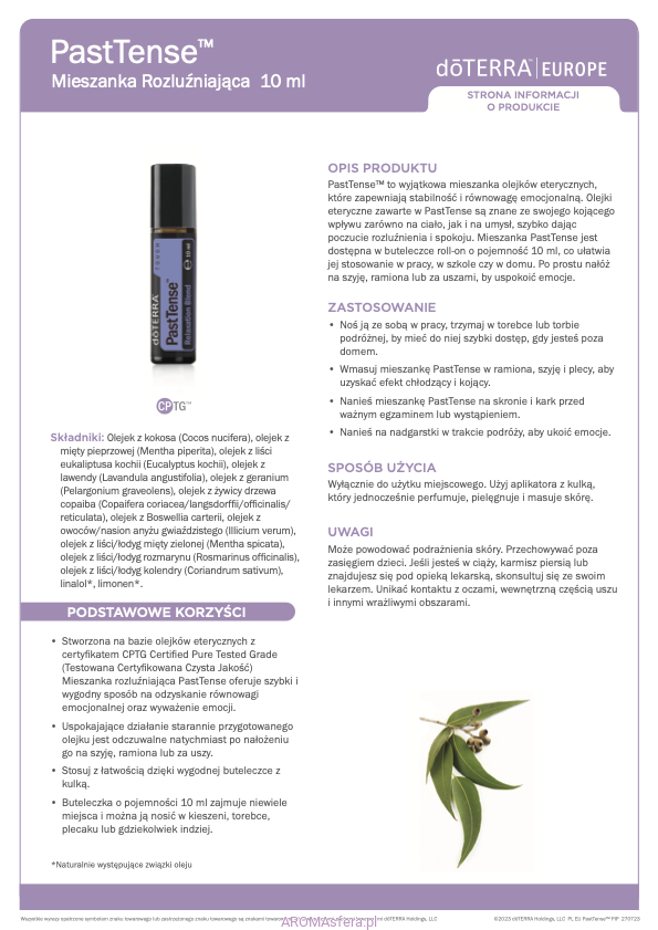PastTense to wyjątkowa mieszanka olejków eterycznych, które zapewniają stabilność i równowagę emocjonalną. Olejki eteryczne zawarte w mieszance PastTense są znane ze swojego kojącego wpływu zarówno na ciało, jak i na umysł, szybko dając poczucie rozluźnienia i spokoju. Mieszanka PastTense jest dostępna w buteleczce roll-on o pojemność 10 ml, co ułatwia jej stosowanie w pracy, w szkole czy w domu. Nanieś na szyję, ramiona lub za uszami, aby uspokoić emocje; pomoże również wdychanie kojącego, wyjątkowego aromatu PastTense.