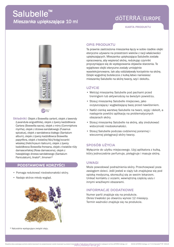 Mieszanka upiększająca Salubelle to opatentowana mieszanka rzadkich olejków eterycznych używanych na przestrzeni wieków z racji ich upiększających właściwości, która została opracowana w celu pielęgnacji i odżywiania skóry. Nasi eksperci dobrali olejki eteryczne tej unikalnej mieszanki tak, aby Twoja skóra wyglądała gładko, promiennie i młodo. Salubelle łatwo się wchłania, zmniejszając widoczność drobnych i głębokich zmarszczek oraz redukując oznaki starzenia się skóry. Wygodna buteleczka z kulką ułatwia nakładanie mieszanki Salubelle na twarz, szyję i dekolt.