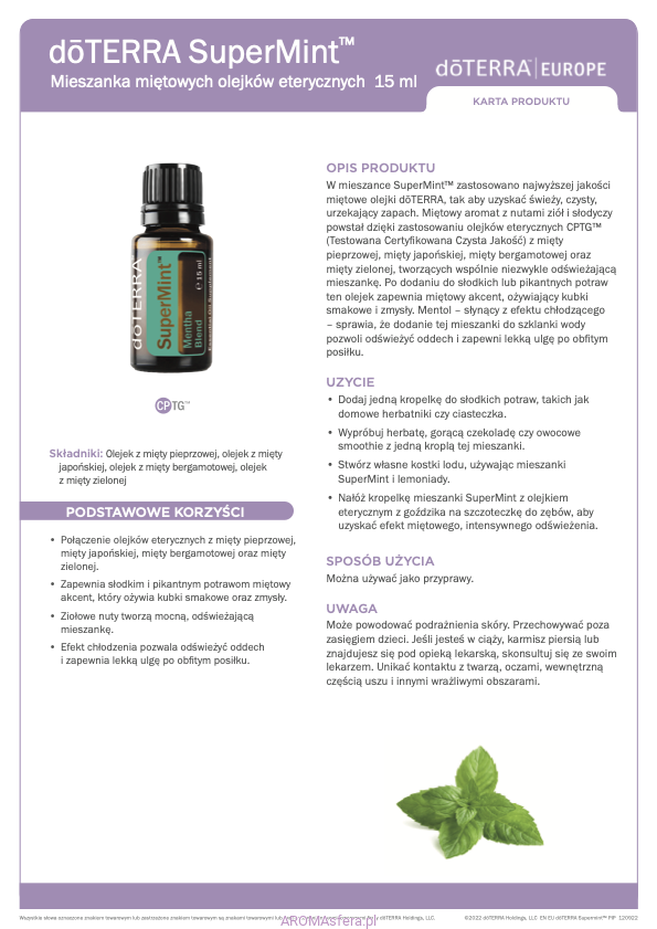 W mieszance SuperMint zastosowano najwyższej jakości miętowe olejki doTERRA, tak aby uzyskać świeży, czysty, urzekający zapach. Miętowy aromat z nutami ziół i słodyczy powstał dzięki zastosowaniu olejków eterycznych CPTG™ (Testowana Certyfikowana Czysta Jakość) z mięty pieprzowej, mięty japońskiej, mięty bergamotowej oraz mięty zielonej, tworzących wspólnie niezwykle odświeżającą mieszankę. Po dodaniu do słodkich lub pikantnych potraw ten olejek zapewnia miętowy akcent, ożywiający kubki smakowe i zmysły. Mentol – słynący z efektu chłodzącego – sprawia, że dodanie tej mieszanki do szklanki wody pozwoli odświeżyć oddech i zapewni lekką ulgę po obfitym posiłku.