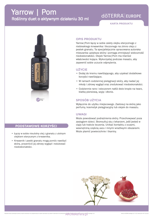 - Codziennie rano i wieczorem aplikuj dwie krople na twarz, klatkę piersiową, szyję i ręce, aby skorzystać z właściwości rewitalizujących i ochronnych olejku Yarrow|Pom.