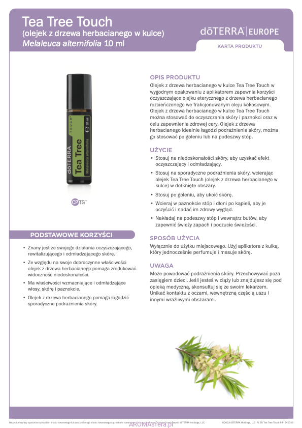 • Stosuj na sporadyczne podrażnienia skóry, wcierając olejek Tea Tree (Melaleuca) Touch (olejek z drzewa herbacianego w kulce) w dotknięte obszary.