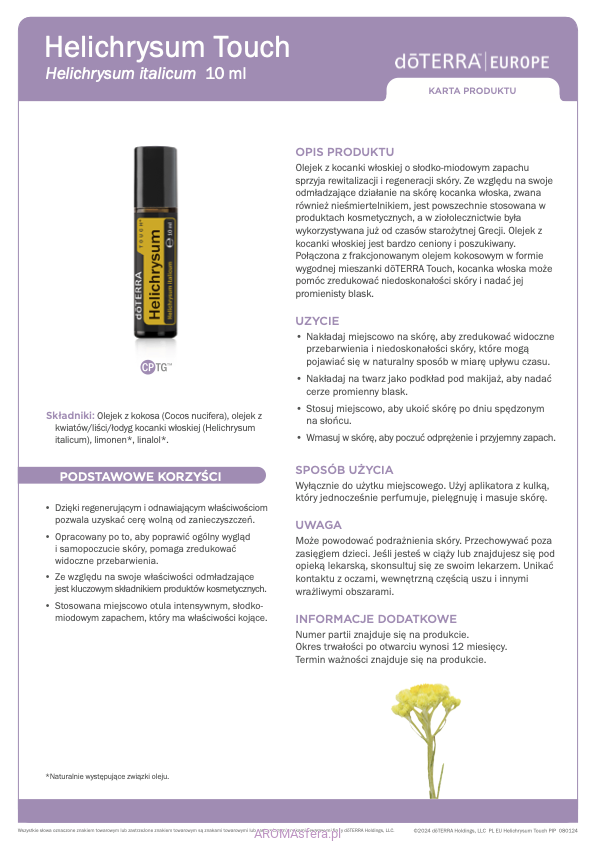 Olejek z kocanki włoskiej o słodko-miodowym zapachu sprzyja rewitalizacji i regeneracji skóry. Ze względu na swoje odmładzające działanie na skórę kocanka włoska, zwana również nieśmiertelnikiem, jest powszechnie stosowana w produktach kosmetycznych, a w ziołolecznictwie była wykorzystywana już od czasów starożytnej Grecji. Olejek z kocanki włoskiej jest bardzo ceniony i poszukiwany. Połączona z frakcjonowanym olejem kokosowym w formie wygodnej mieszanki doTERRA Touch, kocanka włoska może pomóc zredukować niedoskonałości skóry i nadać jej promienisty blask.