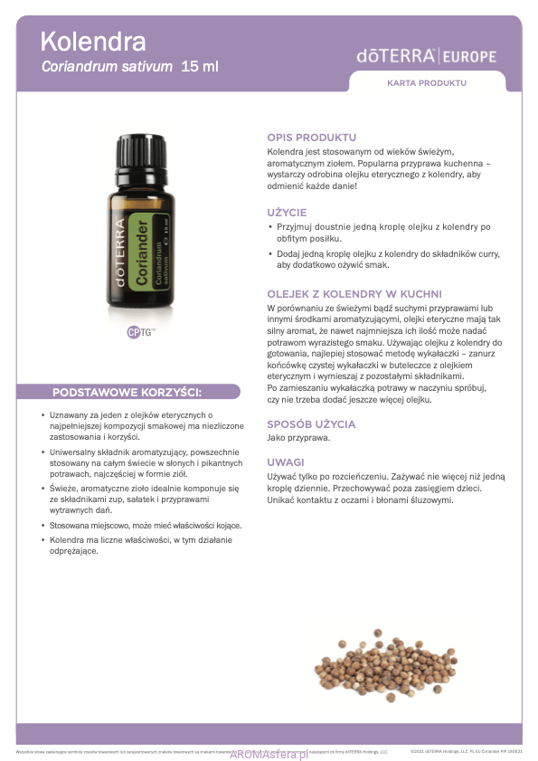 Kolendra jest stosowanym od wieków świeżym, aromatycznym ziołem. Popularna przyprawa kuchenna – wystarczy odrobina olejku eterycznego z kolendry, aby odmienić każde danie!