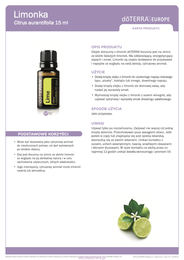 Olejek eteryczny z limonki dōTERRA tłoczony jest na zimno ze skórki świeżych limonek. Ma odświeżający, energetyzujący zapach i smak. Limonki są często dodawane do przystawek i napojów ze względu na swój świeży, cytrusowy aromat.