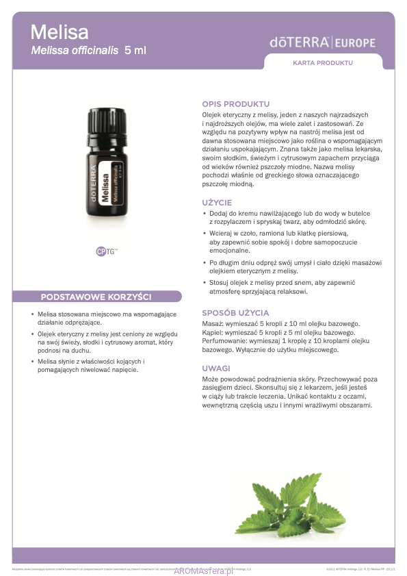 - Olejek eteryczny z melisy jest ceniony za świeży, słodki i cytrusowy aromat, który poprawia nastrój i działa orzeźwiająco, a także wpływa na poprawę ogólnego samopoczucia emocjonalnego.