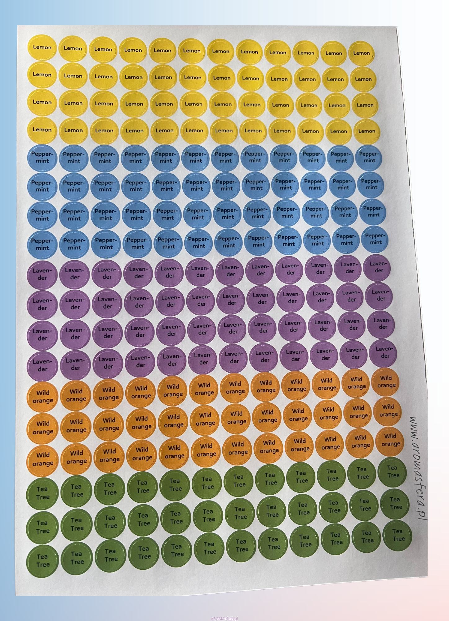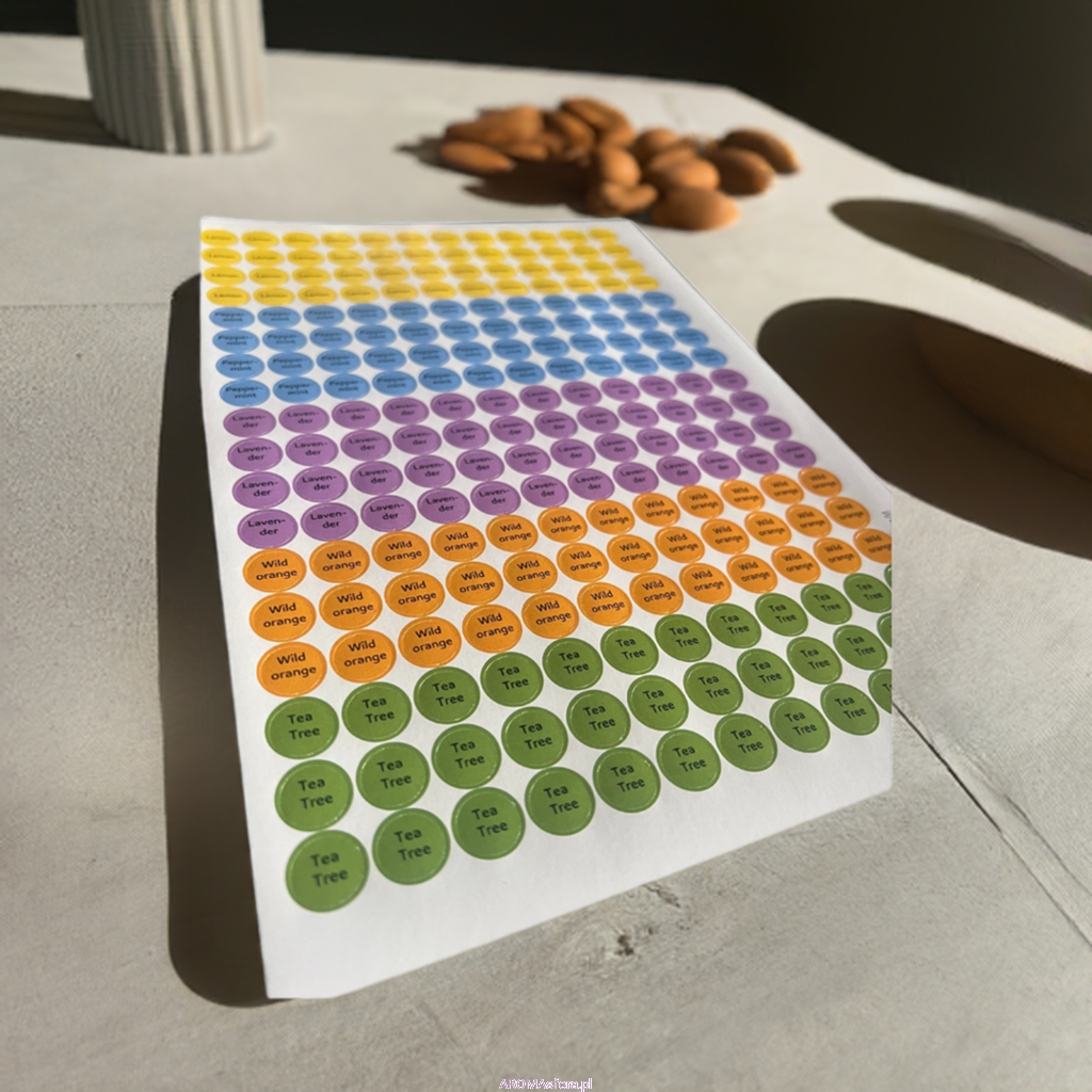 Ułatw sobie organizację kolekcji olejków eterycznych dzięki praktycznym naklejkom na zakrętki! Każdy arkusz zawiera 218 naklejek z oznaczeniami pięciu najczęściej używanych olejków: