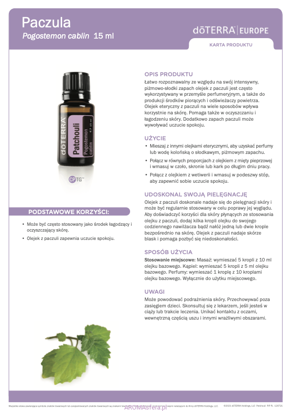 Łatwo rozpoznawalna ze względu na swój bogaty, słodko-piżmowy zapach, paczula jest regularnie stosowana w przemyśle perfumeryjnym, a także w produktach zapachowych, takich jak detergenty do prania i odświeżacze powietrza. Olejek eteryczny paczuli korzystnie wpływa na skórę na wiele sposobów. Zapewnia cerze gładkość oraz blask i często jest stosowany miejscowo w celu zmniejszenia widoczności wyprysków lub drobnych niedoskonałości skóry. Zapach paczuli może również pomóc w wyciszeniu emocji.