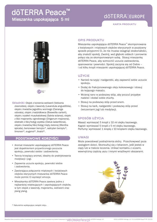- Aromat mieszanki doTERRA Peace to zapewnienie spokoju, pokrzepienia i zadowolenia.