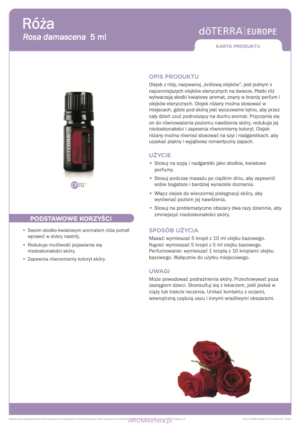 Olejek z róży, nazywanej „królową olejków”, jest jednym z najcenniejszych olejków eterycznych na świecie. Płatki róż wytwarzają słodki kwiatowy aromat, znany w branży perfum i olejków eterycznych. Olejek różany można stosować w miejscach, gdzie pod skórą jest wyczuwalne tętno, aby przez cały dzień czuć podnoszący na duchu aromat. Przyczynia się do równoważenia poziomu nawilżenia skóry, redukuje niedoskonałości, a także sprawia, że cera ma zdrowy wygląd i równomierny koloryt. Olejek różany można również stosować na szyi i nadgarstkach, aby uzyskać piękny i wyjątkowy romantyczny zapach.