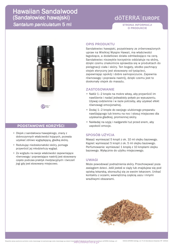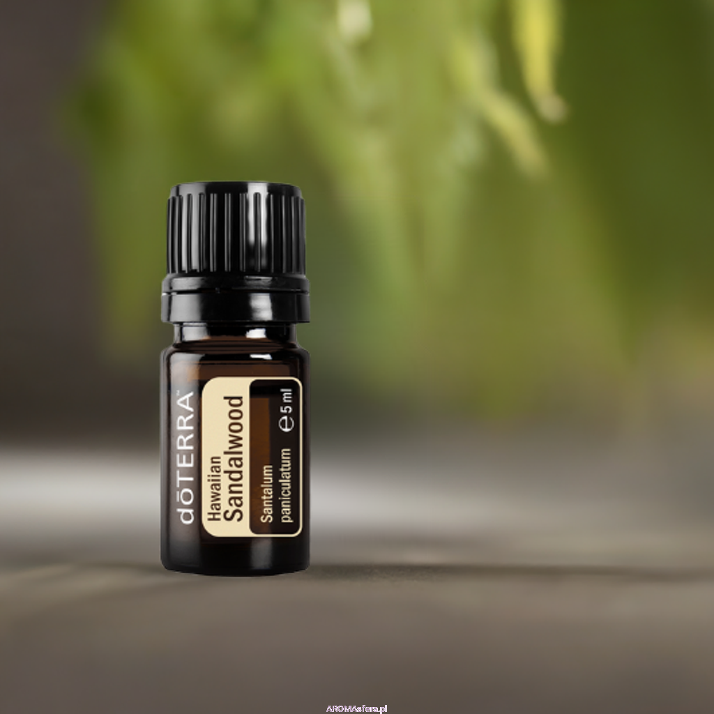 - Olejek z sandałowca hawajskiego, znany z dobroczynnych właściwości kojących, pozwala uzyskać zdrowo wyglądającą, gładką skórę.