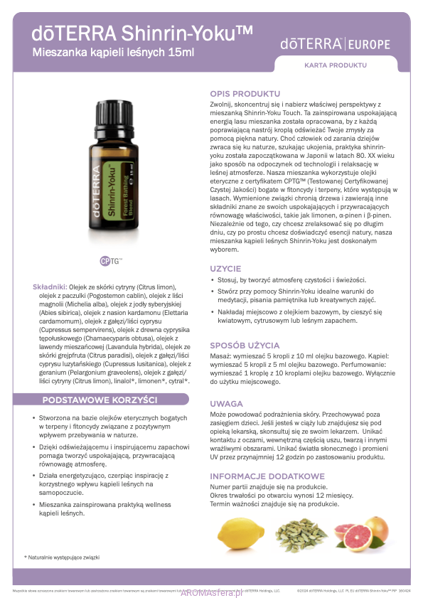 Zwolnij, skoncentruj się i nabierz właściwej perspektywy z mieszanką Shinrin-Yoku Touch. Ta zainspirowana uspokajającą energią lasu mieszanka została opracowana, by z każdą poprawiającą nastrój kroplą odświeżać Twoje zmysły za pomocą piękna natury. Choć człowiek od zarania dziejów zwraca się ku naturze, szukając ukojenia, praktyka shinrin-yoku została zapoczątkowana w Japonii w latach 80. XX wieku jako sposób na odpoczynek od technologii i relaksację w leśnej atmosferze. Nasza mieszanka wykorzystuje olejki eteryczne z certyfikatem CPTG™ (Testowanej Certyfikowanej Czystej Jakości) bogate w fitoncydy i terpeny, które występują w lasach. Wymienione związki chronią drzewa i zawierają inne składniki znane ze swoich uspokajających i przywracających równowagę właściwości, takie jak limonen, α-pinen i β-pinen. Niezależnie od tego, czy chcesz zrelaksować się po długim dniu, czy po prostu chcesz doświadczyć esencji natury, nasza mieszanka kąpieli leśnych Shinrin-Yoku jest doskonałym wyborem.